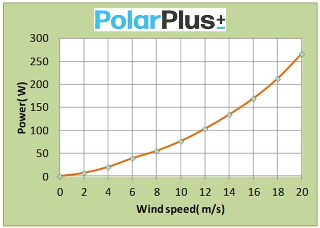 Effekt: <300W Anlegg: 12V Spenning fra kontroller: 0V – 14,4V 90W på vindskalaen gir ca. 12,0V Automatisk dreining mot vindretningen for optimal effekt Yttermål med blader: Ø82 cm Netto vekt 11,1 kg PolarPlus Vindgenerator Vindgeneratoren er designet for å avlaste batteriet med å drifte 12V produkter og lade batteriet når det er tilstrekkelig med vind En del 12V produkter begynner å virke allerede ved 10V noe som tilsvarer 30-40W på vindskalaen Den innebygde kontrolleren aktiverer bremsen som stopper rotoren med strøm fra batteriet ved spenning over 14,4V Spenning over 14,4V oppnås ved for mye vind, ved fulladet batteri eller ved høy spenning fra andre strømkilder i parallell (solcelleanlegg, batterilader) Siden det er batteriet som gir strøm til bremsen for å unngå havari ved for sterk vind, er det viktig at batteriet ikke frakobles uten å sikre vindgeneratoren med tau o.l. for å hindre for høy rotasjon ved vindkast over 20 m/s. Et fulladet litiumbatteri vil blokkere strøm både ut og inn så lenge vindgeneratoren produserer mer strøm enn alt forbruk tilsammen. Derfor må det gjøres ekstra tiltak med tau o.l. for å unngå havari ved vindkast over 20 m/s. Et alternativ er å tilkoble et AGM batteri i parallell som kan gi strøm til bremsen. Vindgeneratoren består av et solid rotorhus med 6 blader av forsterket glassfiber med forventet levetid på 15-20 år ved normal drift. Masta som ikke følger med skal tres utenpå akselen på vindgeneratoren og må ha innvendig diameter over Ø41,5mm Vindgeneratorens pluss-/minus-kabler (15cm) som kommer ut i bunn av akselen skal tilkobles direkte til batteriet. Mast: Ø48×2,5mm følger ikke med i pakken